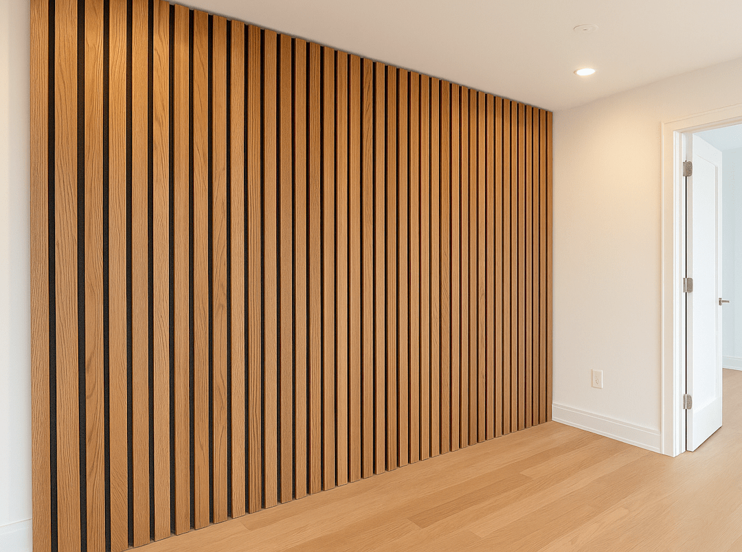 Includes design consultation, felt backing, solid wood slats, mounting, and finishing. Price varies by wood species, slat spacing, and wall height. Excludes LED lighting and custom staining. Most projects completed in 1–2 days.