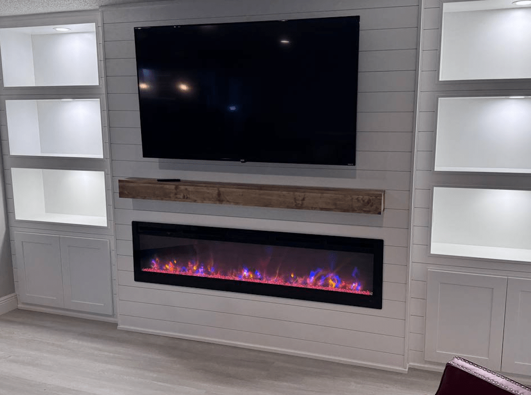 Includes custom layout design, TV mounting preparation, cable management channels, integrated lighting options, and installation of slat, wood, or decorative panel materials. Pricing varies based on materials, lighting complexity, and integrated shelving. Excludes major electrical rewiring or structural changes.